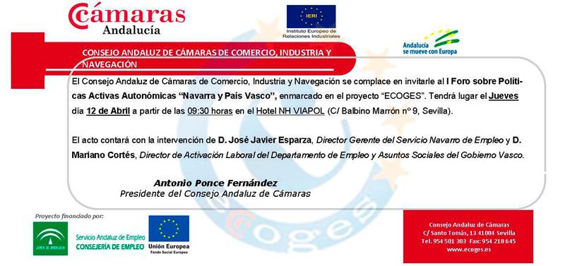 Continuando con los Foros sobre Políticas Activas de Empleo dentro del Proyecto ECOGES del Consejo Andaluz de Cámaras de Comercio de Andalucía, que cuenta con la dirección científica del IERI, el jueves 12 de abril, a las 9:30 horas, comenzó el referido a las políticas activas llevadas a cabo en las Comunidades Autónomas de País Vasco y Navarra, contando con la intervención de los máximos responsables de los Servicios de Empleo de las mismas, el Gerente del Servicio Navarro y el Director de Políticas Activas del Servicio Vasco.